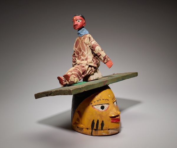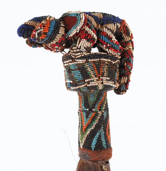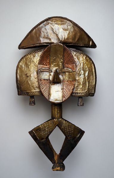 Editor: This vibrant "Mask," created by the Tabwa people around the 20th century, strikes me with its intricate beadwork. What draws your eye to it? Curator: Formally, the mask presents a compelling study in geometry and texture. The triangular shape is softened by the meticulous application of beads and the feather crown, creating a visual dialogue between structure and ornamentation. Editor: It seems to combine both rigid form and decorative freedom. Curator: Precisely. Note how the linear arrangement of the beads on the lower portion contrasts with the curvilinear patterns around the eyes and the chaotic burst of the feathers above. How do you think these varying textures impact the overall composition? Editor: I think they contribute to the sense of visual richness and almost a controlled chaos. What can you tell me about its colour? Curator: The palette is noteworthy. A spectrum of colours are used: reds, yellows, blues, greens, each bounded by crisp borders. Colour becomes line here and plays a vital role in structuring the face. Editor: I see how the color delineation sharpens the form, the line being blurred on other examples of similar masks I’ve researched. The absence of curves across the sculpture create geometric interest, whereas other artists seem to have opted for free form. It almost creates a mosaic effect, as opposed to a more relaxed and less defined pattern. Curator: A keen observation. And the relationship of form to materials—the smallness of the beads allows for detail that paint might not afford. Ultimately it’s about surface tension, contrast, form and material dialogue. Editor: I see how your formal analysis helps break down the complexity of the mask and allows me to appreciate each artistic decision made in the piece.