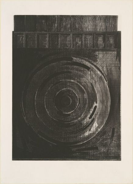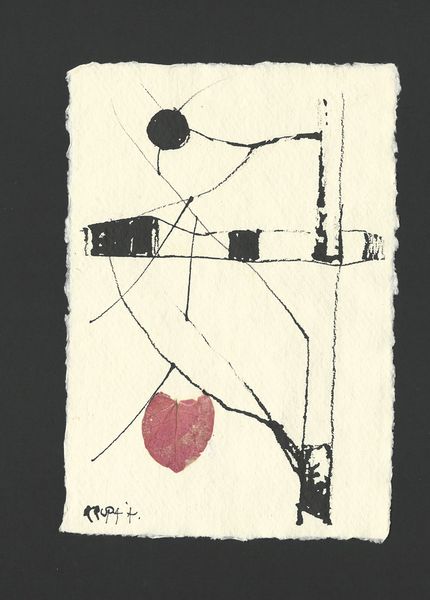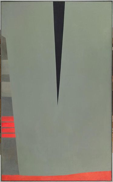 Editor: So this is "Trois disques" by Marcelle Cahn, created in 1966. It's striking how she's arranged these simple geometric forms – circles, primarily – against the deep blue background. I'm really curious to know what you see in it. Curator: For me, these seemingly simple geometric shapes whisper stories of ancient symbols and archetypes. Notice how the dominant circle isn’t just a shape; it’s a mandala, a symbol of wholeness. Within it, we have a pink circle. Pink traditionally represents femininity and potential, nestled against the sharply contrasting black arrow. This suggests a dialogue, perhaps even a tension, between opposing forces, growth meeting definition. How do you interpret that triangular, arrow-like shape, especially its relationship to the containing circle? Editor: I guess I saw it as more of an abstract design element – almost like a stylized Pac-Man? But the arrow as direction, yeah, that makes more sense. Is the downward progression of the smaller circles significant too? Curator: Precisely! They create a downward flow – a visual echo – but their diminishing size changes the weight of the symbol as a force in the composition. There is a slowing or release that the artist intends. It leads our eye downward and outwards into that sea of blue. Do you get the feeling that this points to something about transformation, or even an evolution of consciousness across time, given the stark background? Editor: It's fascinating how much symbolism can be packed into such minimalist shapes. It shifts my entire perspective of it from a playful design to something much more profound. Curator: Indeed! Cahn, in my view, presents us with a codified map. Its minimalist expression echoes a deeper realm, beyond simple optics. What appeared rudimentary now reverberates across historical memory. Editor: That really changes how I'll approach abstract art from now on, searching for the cultural DNA hidden in the forms. Thanks for illuminating this piece for me.