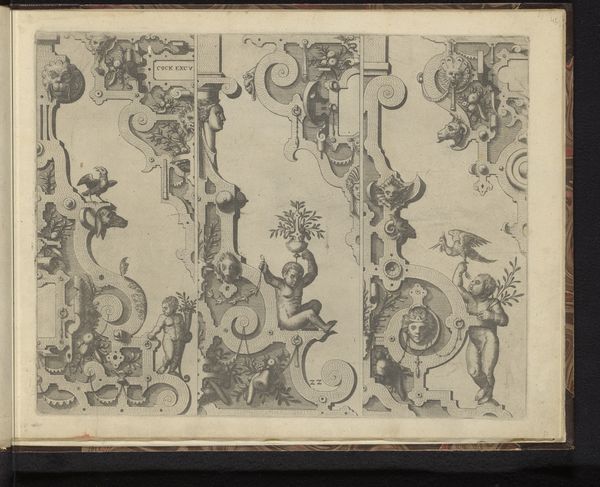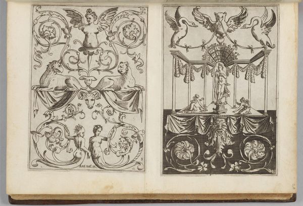 This is a page from Giovanni Ostaus's "La Vera Perfettione del Disegno," dating back to the 16th century, offering designs for embroidery. Observe how the images are laden with symbols, mixing the sacred with the profane. Nymphs and mythological figures are interspersed with bats and snails. Consider, for instance, the central female figure with outstretched arms. Her pose and centrality remind us of the ancient icon of the "Potnia Theron," the mistress of animals, a symbol of nature's untamed forces. This gesture, reaching back to Minoan Crete, reappears through history, each time imbued with new cultural meaning. Note the bat, a creature of the night, often associated with darkness and the subconscious. Its presence here may evoke the darker aspects of the human psyche, fears, and hidden desires. These symbols, interwoven into decorative patterns, suggest a deeper interplay between the conscious and unconscious, inviting viewers to confront their innermost selves. The emotional power of these images lies in their ability to engage us on a subconscious level, stirring primal emotions that transcend time.