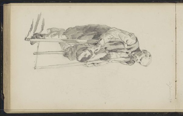 This is a pencil drawing titled, "Man die een stok op zijn schouder draagt," by Johan Hendrik Weissenbruch, residing here at the Rijksmuseum. The piece, through its reliance on line, captures a figure in transit, evoking a sense of transient observation. The figure is defined by rapid, wiry strokes, that build volume and mass, with the darkest tones suggesting the weight of the man's coat and the texture of his trousers. The subject's form emerges from the negative space of the paper, engaging with the philosophical tension between presence and absence. The sketch destabilizes established meanings, inviting the viewer to contemplate the provisional nature of perception. Weissenbruch's piece challenges fixed meanings through its skeletal rendering and invites viewers to question the boundaries of representation. Through a semiotic lens, the walking man transcends the mere depiction of a person to a more profound engagement with the human condition.