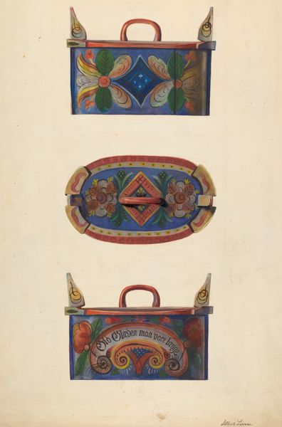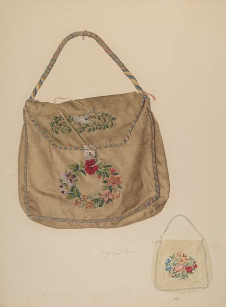 Editor: Here we have Adele Brooks’ "Carpet Bag," created around 1938 using pencil, watercolor, and mixed media on paper. It reminds me of something my grandmother might have had! What do you make of it? Curator: The carpet bag is an interesting object, especially when removed from its functional context and presented as an artistic study. Bags themselves are carriers of meaning, think of Mary Poppins, holding untold possibilities within them. What about the imagery catches your eye? Editor: I like the floral pattern and how neatly it’s laid out, the diagonal stripes with the little flowers almost like pixels. Does the bag's design hold any symbolic significance? Curator: The floral motif certainly speaks to themes of domesticity and perhaps a connection to nature, a tamed and ordered nature. Think about the tension between wild, untamed nature and the controlled patterns we see here. And consider, too, the implied history of carpetbags – often associated with travel and migration, carrying personal belongings and memories. What stories do you imagine this particular bag might hold? Editor: That's fascinating, the contrast between nature and order! I hadn’t considered the travel aspect either; it makes me think about what precious things people would carry with them. Curator: Exactly! And that is part of the image's psychological weight. Perhaps this image offers a quiet meditation on journeys taken, memories carried, and the enduring power of everyday objects. The very act of rendering it immortalizes both the object and its potential narratives. Editor: It definitely makes you think differently about something as simple as a bag! Thanks, I’ve definitely learned something new today! Curator: As have I! The carpet bag reminds us of how objects can echo culture.