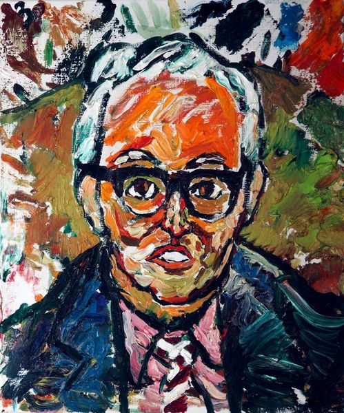 Curator: Before us, we have John Bratby's oil painting "Kathy Wilkes, Fellow and Tutor in Philosophy". It's a striking portrait rendered with, shall we say, a certain…intensity. Editor: Intensity is right. It’s almost brutal, isn't it? The clashing colors and thick impasto—there’s an immediacy and rawness that grabs your attention. It challenges the conventional serenity you might expect from a portrait. Curator: Bratby was known for his expressionistic style. It mirrors, in some ways, the turbulence of the post-war era and perhaps a broader questioning of established norms. There’s a clear departure here from traditional portraiture. The brushstrokes build the image almost fragmentarily, like shards of colored glass coming together. Editor: I am especially struck by his handling of color to convey form. Green and yellow where one expects skin tones; harsh lines in place of delicate features. It's an almost aggressive act of seeing—a visceral reaction, maybe? A symbolic disruption that suggests conflict. Is this possibly related to Kathy Wilkes’s academic focus and its challenges in philosophy? Curator: Potentially. While Bratby provides no explicit commentary within the painting, we understand Wilkes' philosophical focus involved tackling complex and sometimes provocative subjects. The disruptive aesthetic here may symbolize that very engagement with challenging ideas. In some sense, Bratby visually manifests what happens to any icon that undergoes radical questioning. Editor: Interesting how the very materiality of the painting reinforces that theme. The rough texture created by the oil paint becomes an active element in deconstructing idealized images of intellect and poise. It’s a powerful statement about the active, sometimes messy, nature of thinking. It looks more as if it underwent questioning rather than a person doing questioning. Curator: Indeed. The portrait leaves us pondering not only Kathy Wilkes, the person, but also the weight and friction of philosophical pursuit itself. Editor: It certainly does give a feeling of unease. A raw statement to carry away after considering the painting closely.