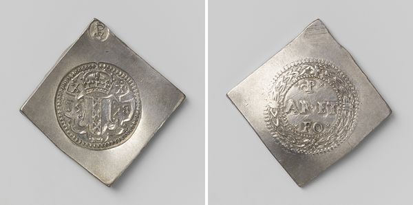 Curator: This intriguing metal relief, dating from 1706, is titled "Karel III koning van Spanje en vervulling van het luchtvisioen van de beide vechtende jongelingen uit 1536." The level of detail for something engraved in metal is incredible! What are your first impressions? Editor: I'm struck by how much information they pack into a small space. You have the central figure, almost angelic, and then this detailed text… What can you tell me about its purpose? Curator: Well, as a materialist, I immediately consider the context of its production. Metal reliefs like this weren’t “art” in the modern sense but rather tools of power. Consider the material: metal, durable, valuable, capable of being reproduced. How does the choice of metal reflect the wealth and ambition of its commissioner? Editor: It suggests permanence, like they wanted the message to last! Curator: Exactly. Think about the labor involved in creating such a detailed engraving. Skilled artisans, carefully shaping the metal according to a design, for a political purpose. It’s a physical manifestation of ideology, a means of shaping public opinion, almost like propaganda of the day. What statements does that production process make? Editor: The amount of work really signifies importance... this wasn't something dashed off quickly, but rather an assertion meant to solidify King Charles III's image. And the relief, the way the metal is raised, emphasizes its permanence and validity. Curator: Precisely! It bridges art and craft, high ideals and grounded labour, all to consolidate power. Understanding how these objects were made, who made them, and why reveals so much about the societies that produced them. Editor: So, by analyzing the metal, the labor, we understand the political intentions… very interesting. Thank you! Curator: A materialist lens allows us a grounded understanding of even seemingly ethereal art!