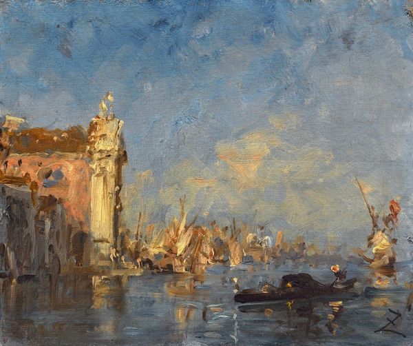 Editor: So, here we have John Singer Sargent’s "Spirito Santo, Saattera" from 1903. It looks like a watercolor, and there's something really fluid about the way he's captured Venice. It feels like a fleeting moment. What do you see in this piece? Curator: This work is interesting because Sargent is primarily known as a society portraitist. Yet here he is engaging with landscape, using watercolor no less, a medium often associated with amateur practice, to depict the built environment. The materiality is key here. The translucent washes of color allow us to see the paper beneath, flattening the image and emphasizing the constructed nature of representation itself. Consider the speed and economy of gesture required to capture the fleeting light and movement. Is he documenting Venice or actively constructing it as a product, a brand? Editor: That’s fascinating. I hadn't thought about watercolor being associated with amateur work. So, is he intentionally blurring the lines between a quick sketch and a more "serious" oil painting? Curator: Precisely. Think about the burgeoning tourist industry in Venice at this time. These easily portable watercolors were, in a way, a consumable good themselves, souvenirs for the upper classes. This challenges conventional understandings of fine art being distinct from commercial enterprise. What, then, is Sargent doing with his own artistic labor? Editor: So, he's using this "everyday" material to create what looks like a common subject, but he's really questioning value and production. I suppose that changes how I see the boats and buildings here. They're less romantic and more…commodities? Curator: Exactly. It encourages a critical look at how places become spectacles and art objects get entangled with capitalist systems. Editor: This really gives me a new way to look at the painting. It’s not just a pretty picture; it's a reflection of a whole economic and social structure. Thank you!