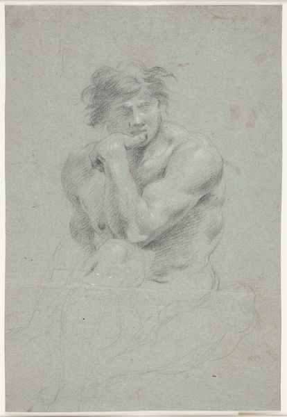 Editor: Here we have Simon Vouet's "Faun of sater, zittend naar rechts," a pencil drawing created sometime between 1600 and 1665. It's such a vulnerable pose, the way he's turned away. What’s striking to you about this piece? Curator: Well, this sketch offers us a glimpse into the Baroque era's fascination with classical antiquity, but with a definite social spin. Vouet, while adopting the idealized form, presents this faun in a moment of introspective repose, almost melancholic. Consider the socio-political context: Were these depictions of mythological figures merely artistic exercises, or did they serve as veiled commentary on power, sensuality, or even the fleeting nature of earthly pleasures? What might it say about the audience it was created for? Editor: So, it's not just about idealizing the body, but about communicating something more? Curator: Exactly! These images circulated among the elite. Vouet and his contemporaries had an audience in mind and were deeply influenced by the art market. I wonder, what message might a wealthy patron, accustomed to exerting power, glean from this representation of a mythological being lost in thought? The gaze turned inwards, in a way, almost denying the viewer direct access, or agency. Editor: That’s really insightful. I hadn’t considered the role of the patron in shaping the artwork’s meaning. Curator: The market was changing and the social function of art evolved with it, something Vouet masterfully understood. Editor: This has definitely opened my eyes to thinking about art in a new light, thinking of the viewer and what they would get from it, rather than simply my immediate emotional reaction. Curator: That is the first step. Understanding art’s dialogue with history provides invaluable context for interpreting it.