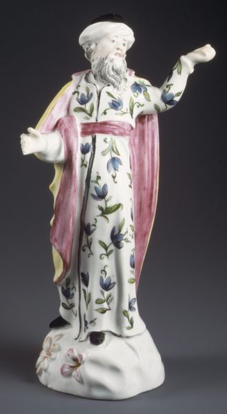 Curator: This charming artwork is titled "Figure of a standing Chinese man," dating back to somewhere between 1735 and 1745. It’s a porcelain sculpture currently residing here at the Metropolitan Museum of Art. Editor: My first impression is…surprise, honestly! He’s got such a benevolent gaze and those delightfully long whiskers. There is a kind of casual opulence here with those big sleeves, which makes me think this figure wants to kick back and tell a long story, what do you think? Curator: You know, that feeling makes sense, especially given the decorative style of the period. The piece reflects an era fascinated with chinoiserie, an aesthetic trend where European artists incorporated motifs and imagery inspired by Chinese art and culture. His gentle face carries so much cultural memory now. Editor: Memory, that's a great point. But it also occurs to me that someone, somewhere, at some point was making this sculpture in almost a decorative style. Is that memory perhaps in fact misinterpretation through that European Baroque sensibility? Curator: Perhaps, but Baroque decorative arts carry their own semiotic weight, particularly around wealth, internationalism, and trade. The clothing on the man for example references elite taste and luxury. These imported cultural references, even if re-interpreted, allowed Baroque societies to express global awareness. Editor: Hmm, right. So, not necessarily authentic, but a projection of that period’s version of 'exotic'… which kind of places another layer of significance to it now for modern viewers, too, reflecting as it does both societies. Curator: Exactly. Even the decision to depict him standing, rather than in a more traditional seated pose, is likely a deliberate choice meant to align the figure with Western portraiture conventions. These symbol-filled Baroque styles carried over. Editor: And that subtle smirk—so knowing, so sophisticated. It all sort of blends together, that mix of Chinese subject rendered in such a European style. A very powerful commentary on cultural exchange… intentional or not. Curator: Indeed. Every choice – material, pose, details – contributes to this complex dialogue, still ongoing between cultures, traditions, and perspectives. Editor: Well, I will certainly have more to chew on now. This fella may just tell even more than just long stories; there is an awful lot more contained within than I saw at first glance!
