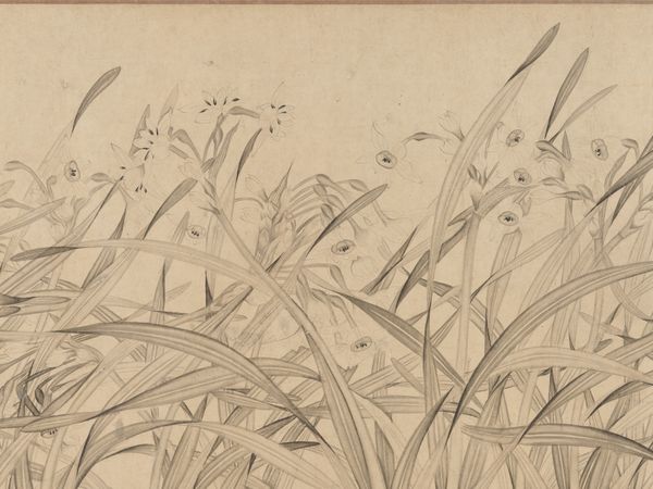 Curator: Before us is "Orchids," an illustration from the Ten Bamboo Studio Manual of Calligraphy and Painting by Hu Zhengyan, created during the late Ming Dynasty. Editor: There's such fragility in these delicate lines. The composition feels both sparse and elegant, doesn't it? Curator: Indeed. Orchids in Chinese art often represent refinement and integrity. They’re symbols of the scholar-gentleman. Editor: Notice how the artist uses only contour lines, creating a sense of ethereal lightness. The negative space is as crucial as the drawn elements. Curator: Absolutely. The monochrome palette accentuates the textural quality of the paper itself, emphasizing the materiality of the work. Editor: It's a study in simplicity and grace, a reminder of the profound beauty found in minimalist expression. Curator: This illustration exemplifies how line, form, and even absence of color, can convey profound cultural meaning.
