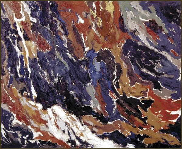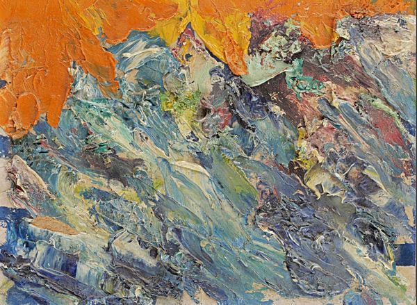 Editor: This is "Landscape," an oil on panel created around 1910 by Arthur Beecher Carles. The impasto is so thick, it's almost sculptural. I am curious what visual structures create such vibrant experience, though the brushstrokes do seem fairly chaotic at first glance. What strikes you most about it? Curator: It’s precisely that tension between chaos and structure that holds the key. Notice how Carles uses individual strokes of color, building up the surface to create a textured field. Forget for a moment the ostensible subject matter of 'landscape'. Consider instead the interplay of colour and form. What semiotic function, for example, is performed by the patches of blues in the upper register against the earth tones lower down? Editor: I see what you mean, those blues do seem to almost…lift off the panel compared to the rest. Is that the intended affect? It really highlights the heavy texture; do you think the materiality itself, that thick impasto, is part of the work's meaning? Curator: Absolutely. The impasto isn't merely decorative; it is integral to the painting’s ontology. It draws attention to the act of painting itself, to the artist's hand and process. Ask yourself what new significance arises when paint itself transforms from a mere substance for representation to a prominent component in and of itself. How does the texture invite closer investigation? Editor: That’s really insightful. Looking at it again, it does shift from being 'a landscape' to being about paint itself, the colors and their relationships. Like I am more engaged with the art of painting. Curator: Precisely. It moves beyond mere representation towards abstraction, even while gesturing to representational traditions. The colour activates the viewing plane. A negotiation of figure/ground relationships becomes a new pictorial space that requires the viewer to make sense of it according to their own rules of sensemaking. Editor: So, the essence of this painting resides not in what it depicts, but in how it's constructed visually and materially. I am left reflecting on its colors and their material presence in a new way. Curator: Precisely. And how our interpretation can change so vastly from just the way colours interplay.
