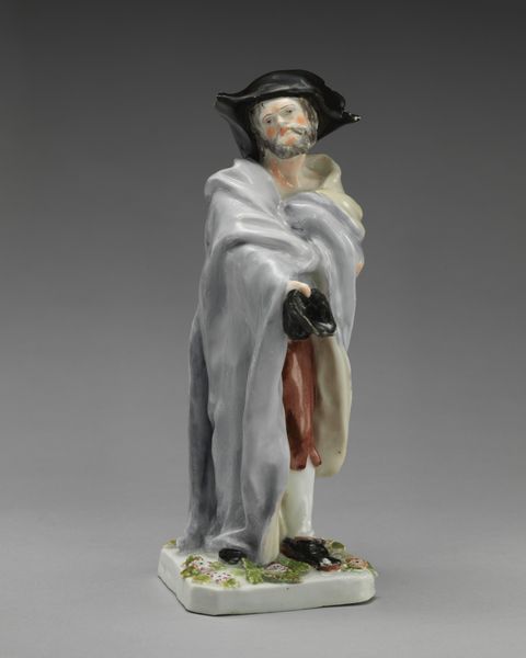 This porcelain figure of a doctor was made by the Chelsea Porcelain Manufactory between 1744 and 1784. Notice how the figure's exaggerated posture and facial expression immediately convey a sense of caricature. The artist's use of the porcelain medium allows for fine details, like the frilled collar and the striped hat, which add to the figure's whimsical appearance. The carefully chosen palette, juxtaposing soft pinks and deep purples, enhances the visual appeal, while the glossy finish reflects light, animating the composition. The structural imbalance—the figure leaning precariously—challenges the conventional expectations of stability in sculpture, suggesting a deeper commentary on the human condition and the precariousness of health. This piece offers a glimpse into the cultural fascination with professions and social roles, rendered through the lens of artistic interpretation. The figure's exaggerated features invite us to reflect on the performance of identity and the ways in which art can playfully question established norms.