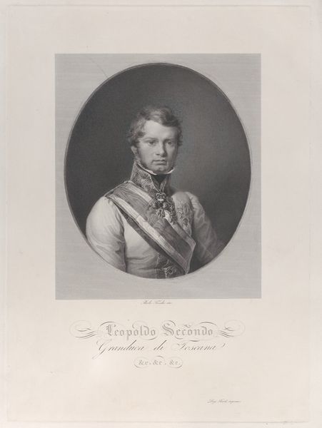 Curator: Gazing at this piece, I am struck by a sense of quiet dignity, almost melancholy. The soft gray tones give it a certain gravity, a timelessness. Editor: Indeed. What we are looking at here is "Portrait of Leopold II, Grand Duke of Tuscany," rendered in the years 1831 to 1833 by Paolo Toschi. It exemplifies the conventions of the portrait style during the Romantic period. The medium is an engraving, lending to the clear detail in Leopold's facial features and attire. Curator: The symbols of power are quite interesting here. I'm immediately drawn to the sash and medals—visual markers denoting status, position. There’s a visual language at play about hereditary roles, I'd venture to say. But he's young; is there youthful naiveté? It contrasts against the symbols that burden his person. Editor: His position was interesting for sure. Toschi executed this likeness, situating Leopold's role as head of state amidst complex political transitions. Remember, Leopold, despite some reforms, was often caught between liberal desires and Austrian imperial interests, thus making his status delicate to execute visually. Curator: That really hits. There's this kind of softness that comes through Toschi’s engraving. A man shown in uniform that gives no clues, his story kept secret in time as it fades through an oval vignette—his symbols tell the story without words, echoing that internal push and pull you mentioned earlier. Editor: The detail of the rendering enhances this further; Toschi uses shading meticulously to cast shadows around the Duke’s face, which contributes to this atmosphere. What's intriguing to me is also how museums play into the narrative: locating these portraits today reinforces ideas of continuity but perhaps also entrenches certain power structures within our cultural institutions. Curator: Absolutely. I find myself wondering about Leopold's own thoughts, then, as well. An engraving made in multiples allows for visual ubiquity that can become embedded in the public's perception of a leader, making the image its own power symbol. It serves as a conduit for discussing our interpretations of leadership even now. Editor: Indeed. Reflecting on Toschi’s creation provides insight not only into the image but into ourselves— how we interpret authority and history through carefully crafted symbols. Curator: Agreed, the symbols of a bygone era continue speaking today if we choose to listen closely.