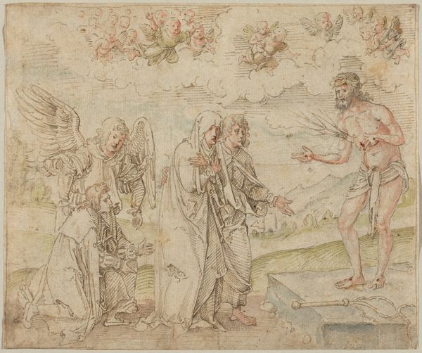 Editor: Here we have William Blake’s "Christ Blessing the Little Children." The figures are so ethereal, almost like they are made of light. What can you tell me about the production of this piece? Curator: Blake’s process is key. He combined printing with hand-coloring, blurring lines between mass production and unique creation. Consider the labor involved, the materials – inks, pigments, paper – all contributing to its impact. Editor: So, the physical making of the artwork informs our understanding? Curator: Precisely. The act of creation, the resources utilized, the societal value placed on such a work – these elements are as crucial as any symbolic reading. It challenges the separation of "high art" from craft. Editor: That’s fascinating. It makes me consider the economic context, too. Curator: Yes! Thinking of materials helps understand the relationship between spiritual expression and material conditions.