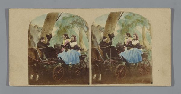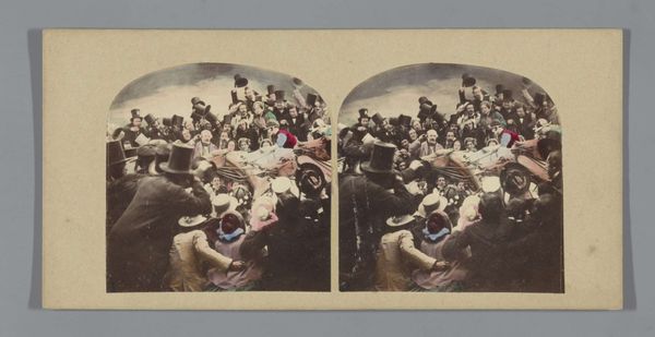 Curator: Looking at this image, my first impression is one of muted chaos. There's a clear arrangement of figures, yet their interactions are unclear, leaving me somewhat disquieted. Editor: You’re right, it does hold a peculiar tension. What we’re looking at is a print titled “Groep mensen op een strand,” which translates to “Group of people on a beach." It's attributed to an anonymous creator and believed to have been made between 1852 and 1863, utilizing a combination of photographic and coloring techniques. Examining its social context might offer some clues. Curator: Absolutely. I'm immediately drawn to the presentation of leisure, and how constructed it all feels. Are these figures presented as types rather than individuals? I wonder about the performative aspects of displaying wealth and social standing in mid-19th century society. And consider the little girl in the lower left corner—set apart, perhaps even excluded. What does this imagery say about class divisions at that time? Editor: That’s a great point. Beach scenes became increasingly popular subjects around this time as coastal towns transformed into tourist destinations. Examining period etiquette guides may clarify these codes of conduct in public spaces. And let's also not forget how photography itself played a role in constructing and disseminating these idealized images. Think about the technical limitations and the labor involved in creating these hand-colored prints. They're definitely staged, curated versions of reality. Curator: Precisely, the labour piece is key: Whose beach leisure are we viewing, and at whose expense? We should ask ourselves how anxieties surrounding industrialization or rapid social changes manifest here. Do the individuals within the photo embody resistance or complicity to this quickly changing society? Editor: Right. We must contextualize it by thinking about how these prints functioned within visual culture. Were they meant to be consumed individually, as mementos? Or did they serve a larger purpose in shaping societal values and norms through the very staging you mentioned? By considering factors beyond the purely aesthetic qualities, like consumption patterns, for instance, and contemporary ideologies, we’re closer to unraveling this picture’s complexities. Curator: It’s funny; Initially, the seemingly banal “day at the beach” almost concealed such intricacies. Now, I see how packed this composition really is—a photograph thick with contradictions around both visibility and historical social mores. Editor: Yes, it's amazing how such an everyday snapshot encapsulates such deep and wide commentary regarding gender, economics and social tensions.