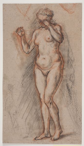 Editor: This is "Kvindelig model set fra siden, gående mod højre," a drawing from 1905-1908 by Aristide Maillol, housed at the SMK. It seems so grounded, almost sculptural, even though it's just charcoal and pastel. How would you interpret this work? Curator: Well, it whispers of ancient forms, doesn't it? Maillol, ever the rebel with a classical heart, pulls us back to a time of idealized human forms, yet he anchors it firmly in the modern world with those raw, honest lines. She is monumental but soft... vulnerable even. Almost like a memory taking form, wouldn't you say? Tell me, what feeling does her averted gaze evoke in you? Editor: A sort of serene introspection, maybe a touch of melancholy? It definitely pulls me in closer. Is this realism, then, with that added dreamy layer? Curator: "Realism" feels almost too…literal. Maillol distills reality, refines it. He seeks the essential, timeless beauty. Think of it more like 'heightened' realism, pregnant with feeling, pregnant with the essence of womanhood... Do you notice how the strong lines contrast with the gentler curves of the figure, like whispers against thunder? Editor: I see it now! The contrasting lines really do create such a dynamic tension! Curator: Indeed. And it is within that tension, that she breathes, takes shape, takes life! That simple, raw power. This drawing...it is, I think, an intimate conversation, where what remains unsaid carries as much weight as what we can see. Editor: It’s fascinating how much can be conveyed through so few lines and tones. Curator: Absolutely, darling. Art often lies not in complexity but in a wellspring of quiet truth. I'm so happy we shared it!