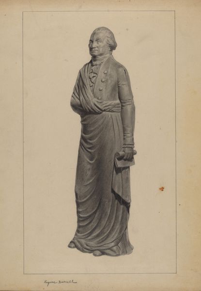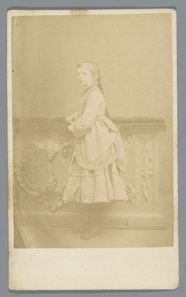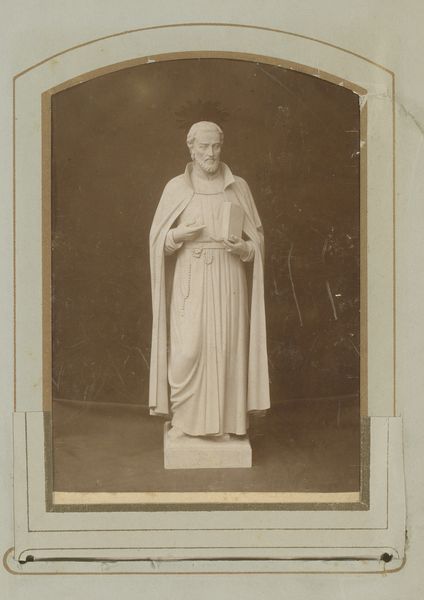 Editor: This photograph captures the gravestone monument of Caterina Campodonico, a sculpture by Lorenzo Orengo, placed in the Staglieno Cemetery in Genoa, Italy, sometime between 1881 and 1890. I find the subject matter and its sepia tones to be melancholic. The figure has simple robes. The trim feels folksy, like a well-loved doll. What draws your attention to this piece? Curator: Immediately, I note the striking realism achieved through the careful manipulation of form. The sculptor, Orengo, skillfully uses the medium to render a life-like depiction of Campodonico, emphasizing detail in the face, dress, and the textile she holds. Consider the relationship between light and shadow across the monument's surface, which enlivens the composition, creating an almost palpable presence. What might you say about the construction? Editor: You mean, how does it feel stable? The multi-tiered base, wider than the main figure, gives it strong foundations. I wonder what sort of stone or material was chosen to construct the monument to achieve the play of light and shadow, it's very successful. What else does its construction accomplish? Curator: This photograph serves to underscore the neoclassical and realist ideals that converged in the late 19th century. The photographer emphasizes the monument’s structural integrity and symmetry and also documents it as a constructed piece, contrasting smooth expanses with textured sections to capture form. Observe, too, the use of geometric shapes in the base versus the complex carving and realism used for the figure of Campodonico, which is where the sculpture's emphasis resides. Editor: That is an astute observation of contrasting geometric versus complex forms. Considering your focus on material properties and form, has anything shifted in your impressions about this work? Curator: Indeed, reflecting on your initial reaction regarding its melancholic nature and observing Orengo's composition, it's undeniable that there's an intent to immortalize, as much through skillful rendering as through mere representation. What about you? Editor: Thinking of this photograph of the monument as an artwork itself has led me to consider the intentional choices involved in its documentation, offering a distinct lens through which to appreciate the sculpture’s craftsmanship.