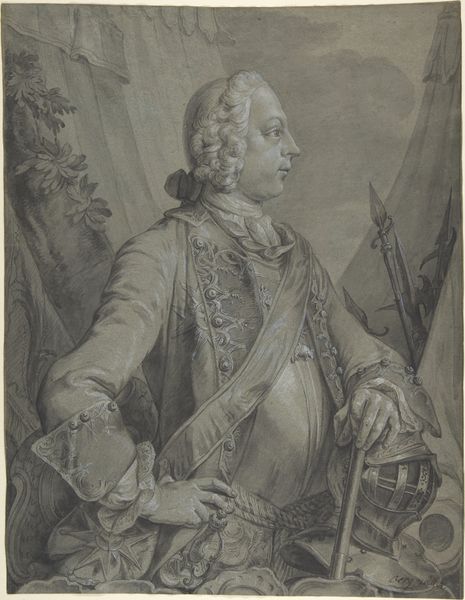This is Joseph Fratrel’s "Portret van Friedrich von Pfalz-Zweibrücken-Veldenz". The print presents a formal portrait, dominated by the central figure composed through the use of chiaroscuro, where the contrast between light and shadow models the contours of the face and garments. The composition places Friedrich slightly off-center, which creates a dynamic tension within the otherwise conventional structure of the piece. The artist employs line and texture to delineate details, from the intricate lace cuffs to the heavy drapery in the background. The gaze is directed towards the viewer, yet it is softened, perhaps to suggest approachability. The subject's physical presence is undeniable, yet Fratrel uses delicate linework to avoid an overwhelming sense of power. The semiotic elements, such as the sash, the sword, and the background figures, establish Friedrich's status and role. It's a study in how form and content interact. In scrutinizing the artwork, we acknowledge that its meaning shifts with each viewing, shaped by the evolving cultural and intellectual landscapes that frame our interpretations.