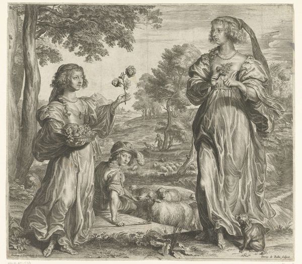 Curator: "Portrait of a Lady and a Boy, with Pan," painted by John Hayls, presents a staged, almost theatrical scene. Editor: It feels strangely dreamlike. The figures are bathed in an ethereal light, but there's a subtle tension in the composition. Curator: The painting appears to blend classical allegory with contemporary portraiture, a reflection of how art served to elevate its subjects in the Stuart era. The integration of Pan suggests a playful connection to nature and perhaps hints at the sitters’ refined tastes. Editor: Notice the detail in the gown; the lustrous fabric, the subtle interplay of light and shadow – it's all meticulously rendered. And what of the Cupid figures hovering above? Curator: Symbols, undoubtedly, of earthly and perhaps divine love and favor. Yet, this idealized representation, in its performance of status, tells us much about the aspirations of the sitters and the society that commissioned it. Editor: Indeed, a fascinating tableau that blends mythology, portraiture, and the subtle performance of social standing. Curator: I agree; a work that invites us to consider the layers of meaning embedded within its elegant surface.