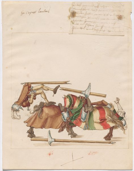 This drawing shows two knights engaged in a mock joust, rendered in ink on paper by an anonymous artist. Though undated, the style suggests it was made somewhere in Europe, perhaps Germany, during the late Middle Ages or early Renaissance. The joust, a martial sport often associated with aristocratic culture, is presented here with a degree of satirical exaggeration: shields are not merely struck but explode into fragments. The riders' costumes are elaborately patterned, and one wears a headdress adorned with flowers, further indicating the performative aspect of these martial events. Such images were often produced for a courtly audience with an interest in chivalric romance and knightly display. But what does it mean to show the mechanics of the combat so absurdly? To answer this question, the social historian would look at court records, popular literature, and other visual sources to understand the nature of the audience and the artist's critical stance. After all, artistic interpretation is only possible if we can understand the values and institutions that shaped its creation.