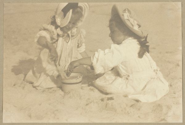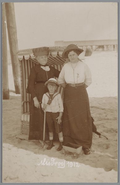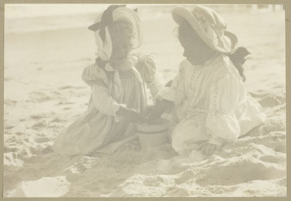 Curator: This is a photograph titled "Two Women with a Child on the Beach in Scheveningen," dating roughly between 1923 and 1928. Editor: There's a hazy quality to the image. The tonality evokes a sense of gentle quietude, doesn't it? Almost melancholic. Curator: I agree, and observe how the composition directs our eye. The subjects are centrally positioned, creating a stable triangular structure which is reinforced by the tonality of the scene. The sand mound becomes almost sculptural. Editor: Precisely. Think about the sand itself – ordinary matter, transformed through the actions of play and leisure, into something almost monumental. And who labored to construct that mound, how long it took? Curator: An astute observation. Though, materially, the photograph flattens this transient monument. As photography, it preserves the fleeting nature of this moment. What statements, or lack of, are you left to draw upon between what appears like two sisters on an outing with the child? Editor: It speaks to the culture of beach outings, particularly for women and children, during the early 20th century, the construction of that social space, the expectation and allowance of access. These factors determine the material and labor in play. The tools used to manipulate the materials on hand also dictate the final result. Curator: But the lack of affect in their faces! Are we looking at a performative activity here? Does that influence the structure itself, given that our awareness makes it a sort of memento mori as they fade in age? Editor: It certainly makes me wonder about the artist's intentions versus the subjects. The picture offers insight into societal rituals of leisure, it prompts inquiry. We're compelled to evaluate labor, play and their value as depicted and also our access. Curator: You're right. Focusing on material production reveals how everyday practices can become sites of creative and cultural inquiry. Editor: And examining this further offers a lens through which we consider what that all means for contemporary values too.