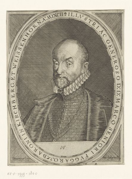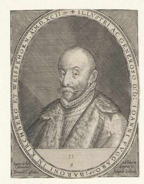 This is an engraving of Niels Kaas by Johann Christoph Sysang, made at an unknown date. Kaas was a Danish statesman and jurist, holding high offices under the Danish crown. This print participates in a visual language of power and authority. Kaas is framed in an oval border, which lends him an air of classical dignity, with draped curtains to signify his status. The fur trim around his cloak and the elaborate chain and pendant declare his wealth and status. The family crest at the bottom serves as an announcement of his lineage. Prints such as this were instrumental in shaping the public image of political figures in the early modern period. By studying the visual conventions of portraiture and the symbols of power, we can begin to understand how leaders sought to project their authority and legitimacy. To gain a deeper understanding of this work, it is necessary to consult historical sources that shed light on the social and institutional contexts in which these images were produced and consumed.