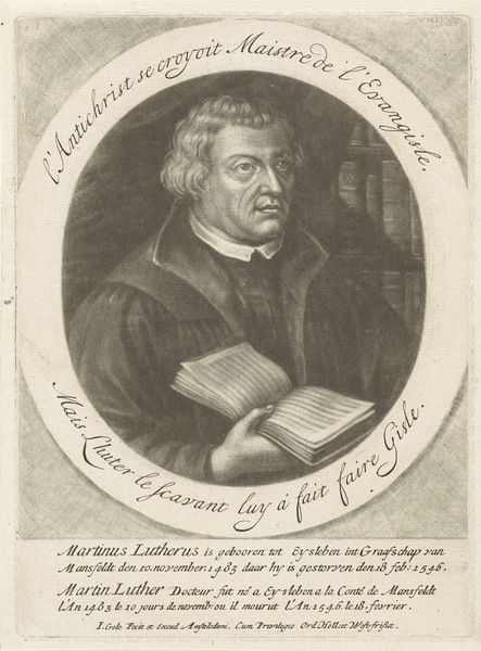 Jacob Schwartzenbach created this portrait of Hermanus Adrianus Bruining around 1790 using etching and engraving techniques. During the late 18th century, portraits often served as symbols of status and identity, particularly within the Dutch middle class. Bruining, depicted here, was likely a prominent figure, possibly within religious or intellectual circles. Notice the books in the background and the one he holds, they suggest a man of learning and faith, reinforcing the era's emphasis on education and piety. The portrait is framed in an oval, a traditional choice that adds a classical touch, and also includes Dutch text that speaks to Bruining's virtues. It's interesting to consider how Schwartzenbach uses conventional methods to portray Bruining while also revealing the personal and societal values esteemed during this period. This piece offers us a glimpse into the life and identity of a man within the specific cultural and religious context of his time.
