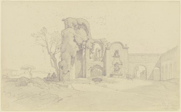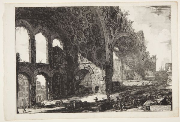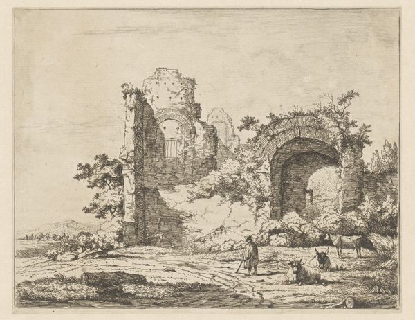 Editor: We're looking at "Ruins", an undated etching by Jan Gerritsz van Bronckhorst. The use of line is incredible – so delicate, yet it conveys such a powerful sense of decay. I am particularly drawn to how the light interacts with the architectural remains. What compositional elements stand out to you in this work? Curator: Certainly. Note the artist's mastery of line – how it defines form and creates texture, delineating the crumbling architecture. Focus on the composition, observing the strategic placement of the ruins, establishing a dialogue between mass and void. Semiotically, the broken arches and fragmented structures are indices of lost grandeur. Do you perceive a relationship between the architectural elements and the figures within the scene? Editor: I hadn't thought of that specifically, but now I see how the figures seem almost dwarfed by the scale of the ruins. It accentuates the transient nature of human existence compared to the enduring, albeit decaying, structures. Curator: Precisely. The contrast amplifies the theme. Notice how the etching technique itself, with its intricate network of lines, contributes to the overall texture. In the artist's handling, we find a commentary on temporality and permanence through visual means. Editor: So, the ruin isn't just a subject, but also a structural component within the visual narrative. Thank you! I'm learning to think about art in entirely new ways. Curator: It's about seeing beyond representation. The language of art lies in its formal structure, its internal logic. Examining how these elements work in concert illuminates the deeper meaning.