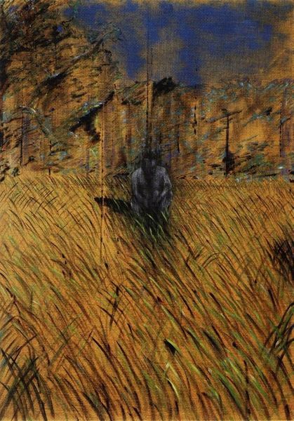Curator: Today, we’ll be examining Boris Kustodiev’s oil painting, "Fireplace (Night)," created in 1917. Editor: It strikes me immediately as both serene and unsettling. That plume of smoke, rendered in soft pinks and purples, rises so dramatically against the muted sky, like a dream almost. Curator: Kustodiev employs a fascinating juxtaposition of rustic simplicity and expressive brushwork. Note how the composition is divided: on one side, a small fire and figures, and on the other, horses graze among the trees. Editor: The horses are the anchor for me—they evoke a feeling of pastoral calm, while the fire with a boy nearby adds an element of human presence, tinged with a kind of vulnerable isolation, don't you think? There’s something haunting in how the animals simply exist separate of everything, really feeling like dream animals. Curator: I agree that their poses create a visual dichotomy. The brushstrokes too—see how they vary from smooth and blended in the horses to much more agitated around the blaze. These tonal shifts underscore the psychological dimensions. Editor: Definitely. Also the stump covered field - a past life, but it is night as well - suggesting a turn, or transition. A neo-expressionist feeling, the light is very dramatic here, giving the figures an incredible amount of form and contrast to each other and with nature as well, it truly breathes this new life that seems as though something happened, or has yet to occur. The artist's vision here seems to give it life far beyond genre. Curator: Kustodiev's ability to capture this kind of subtle psychological play is something that draws many people to this moment from Russian avant-garde art. It encapsulates many artistic explorations of that time. Editor: And now, standing here considering all of that - now I just feel warm with gratitude that so much can be found within a landscape, it gives much space to exist. It's like falling into time again.