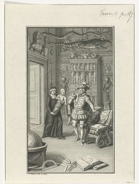 Curator: Here we have a print from 1788, titled "Maria en Friedrichs zus schrikken van zijn toestand," or "Maria and Friedrich's Sister are Shocked by his Condition," crafted by Mathias de Sallieth and housed here at the Rijksmuseum. It's an engraving that seems to capture a moment of unexpected arrival. Editor: Yes, unexpected is the word. My first impression is stark shock. The contrast between the clean lines of the interior and the disheveled appearance of the entering figure creates a real visual discord. It’s almost theatrical. Curator: It's fascinating how Sallieth uses line to depict both the physical details and the emotional reactions. Considering its era, prints like this had a very important social function. They provided a relatively inexpensive way for people to consume images and narratives, disseminating both information and social mores. Editor: Indeed. Looking closely, one immediately picks up on how the 'condition' of the figure acts as the visual centerpiece, his attire speaks of distress and otherness. The sister's gesture, pulling her shawl tighter, is telling; there's a clear boundary being established, perhaps signifying fear or disgust. Is there a particular symbol associated with it? Curator: Perhaps not a specific one symbol but it's worth reflecting on what that state and type of dress might represent at the time in a societal sense. To me, there is the stark dichotomy between inside and out, civilised and… not. The careful composition pushes that sentiment to the viewer’s attention. Editor: I see what you mean about societal perception reflected here, and thinking about it, I find something enduring about the power of costume and presentation here. It touches upon those instinctive judgements we all make based on visual cues, and perhaps it challenges that instinct too, nudging us to question that initial shock. Curator: I concur. The value lies in prompting these reflections. Seeing this piece encourages one to ask who is given a voice and representation in these forms, and who might have been traditionally excluded. Editor: Absolutely, a powerful snapshot of social dynamics frozen in time, open for our ongoing interpretation. Curator: A great work that, upon closer inspection, really speaks volumes about that period.