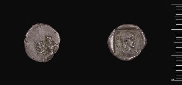 Curator: Let's examine this Drachm of Alexander the Great, minted in Lampsakos. Editor: It's so tiny and worn, yet I feel the weight of history just looking at it. Incredible. Curator: Indeed. Coins served not only as currency, but also as potent symbols of power and propaganda. The portrait of Alexander is itself an emblem. Editor: That stern profile, though! It looks almost godlike with that wild hair and the hint of a diadem. Talk about branding. Curator: The image on the reverse, a seated Zeus holding an eagle, reinforces the ruler’s divine connections and legitimacy. Editor: It’s like a snapshot—or rather, a coinsnap—of an era, miniaturized for posterity. A tangible link to Alexander's ambition. Curator: This little coin really encapsulates the visual language of empire. Editor: Absolutely. I will remember that the next time I find some spare change.