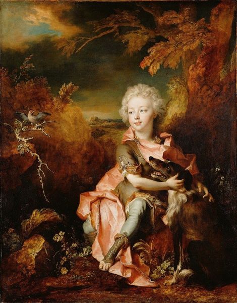 Editor: This is Nicolas de Largillière’s *Portrait de la comédienne Marie-Anne de Châteauneuf, dite Mlle Duclos*, likely painted between 1664 and 1747. It's an oil painting, and it strikes me as incredibly theatrical. There's such dramatic lighting and staging. How do you interpret the composition? Curator: The arrangement of elements is deliberately calculated. Notice how the implied diagonals, from the cupid at the top left to the figures at the lower right, bisect the central figure of Mlle Duclos. Her dramatic gesture functions to engage the viewer, but also highlights the formal device of asymmetry, essential in Baroque composition. Editor: Asymmetry? But she’s positioned fairly centrally, isn't she? Curator: Yes, but her gaze pulls us left, while her gesture guides us toward the shadowed figures to the right, unbalancing our attention. It is not merely a picture; it's a dynamic interplay of forms. The lavish drapery and ornamentation contrast sharply with the muted background, thereby accentuating texture and colour contrasts to achieve maximum visual impact. How does that contribute to the overall impact of the artwork? Editor: I suppose it focuses our attention on the materiality and visual complexity. It feels so much grander, more opulent that way. I also noticed how much detail and how he meticulously created folds in her clothes to give a sense of luxury. Thank you so much for this explanation. Curator: Precisely. Largillière was masterful in manipulating form to evoke emotional and aesthetic response. Consider how this interplay elevates the subject from mere representation to an expressive statement. These formal elements speak volumes. Editor: That’s such an interesting viewpoint; I learned a lot about the visual mechanics. It's like seeing it for the first time!