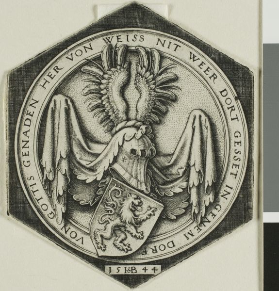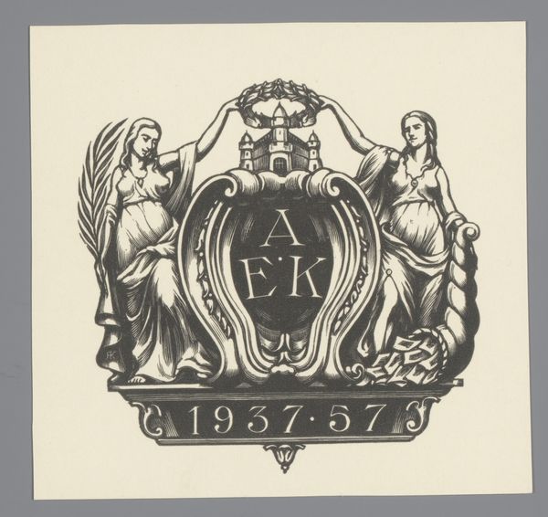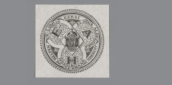 Curator: Here we have an intriguing ex libris, or bookplate, designed anonymously in 1940 for the library of the Algemeen Rijksarchief – the General State Archives. Editor: The first thing that strikes me is its deliberate formality, a graphic emblem striving for timelessness through carefully balanced monochrome elements. Curator: Indeed. The monochrome print uses embossing to create a subtle yet impactful design. Look at the interlocking geometric patterns, especially the overlapping quatrefoil shields dominating the center. Each contains symbolic heraldry. Editor: Right, heraldry acts as visual shorthand, carrying lineages, traditions, and perhaps the values that the archive aims to preserve. The lion rampant in one shield suggests courage and nobility. What’s the meaning of the device in the other? Curator: It is difficult to say without further research, however this careful rendering surely conveys that. Also consider how the typography supports the overall message, an act of preservation within preservation. The bold, circular text frames these symbols within a secure border. It reminds us of coins, a way of investing culture into the piece. Editor: I appreciate that visual analogy. And I think the visual choices speak of cultural memory itself. The act of preserving something for the future makes that cultural act present in that era as well. It acknowledges history while existing in time as history is being made. Curator: Exactly, it bridges time through visual language. It's more than mere ownership, but stewardship for future generations, all bound within that small emblem. Editor: It's amazing how such a limited graphic vocabulary becomes not only functional, to mark a book's origin, but an expressive distillation of cultural values. I'm rethinking my understanding of heraldry altogether! Curator: Exactly, the images help define the historical narratives, but its graphic style keeps it grounded within that moment of history.