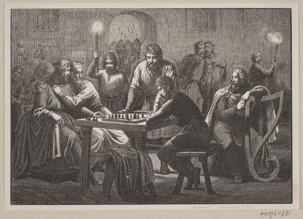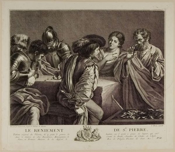 Editor: This is "Tribute Money" by Charles Howard Hodges. The figures are compelling, and I'm curious about the artist's technique, particularly the tonal range achieved in this print. What strikes you most about its formal qualities? Curator: The composition is undeniably structured around chiaroscuro, a deliberate interplay of light and shadow. Notice how Hodges manipulates the tonality to direct the viewer's eye. Editor: So, the contrast isn't just about aesthetics, but also about guiding our attention? Curator: Precisely. The illuminated figures stand in stark contrast to the darker background, creating a sense of depth and dramatic focus. What else do you observe about the arrangement of forms? Editor: I see how the faces are really highlighted and seem to emerge out of the background as a result of that. Thanks! Curator: Indeed, and the way the artist uses tone, it adds a great deal of volume to the painting.