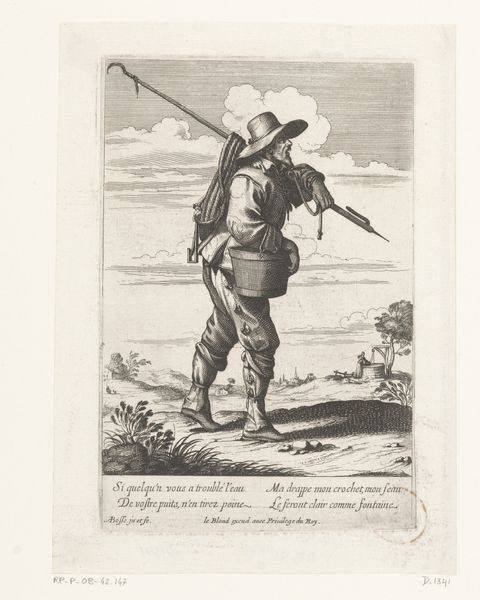 Curator: Here we have "Standing Officer Holding a Lance" created sometime between 1755 and 1771 by Philippe Jacques de Loutherbourg, a compelling engraving. Editor: My first thought is the line work; it’s incredibly detailed but feels almost… playful? There's a vibrancy despite the historical subject. And is he barefoot? Curator: Indeed. It's fascinating how Loutherbourg depicts this officer—certainly an attempt to connect him with the past, invoking perhaps a Roman commander or some other historical military figure, although with those bare feet… Editor: I am also curious about the status and purpose of engravings such as this at this moment in time. Was this aimed at an elite audience of collectors, or was it produced to educate the public, shaping how the military and warfare was percieved? I suppose these would shape public sentiment. Curator: Very astute. Engravings like this had a dual purpose. On one hand, yes, they circulated among collectors interested in historical and military subjects, fueling a fascination with the past. But they also served as visual propaganda, subtly shaping public perceptions of power and military might. It’s interesting that printmaking served to spread Enlightenment ideas about history, even as its subject often depicted aristocratic military leadership. Editor: The detail on the armor versus the looseness of the background, almost as if rendered by different hands, makes me think about labor divisions in the print shop, about how the final object's consistency relies on distinct types of workmanship. Did the studio specialize? How are we to understand printmaking within a capitalist frame? Curator: That is fascinating to think about in regards to the division of labor and its influence on aesthetics! In terms of specialisation: absolutely, large printmaking workshops often had specialists focusing on different elements like figures, landscapes, or ornamental details, adding layers to our appreciation of it as a manufactured item and its historic agency. The Met acquired the work in 1888 which probably added a certain type of distinction at this time. Editor: A fitting purchase date, given the growing appetite of museums for items of this kind during that period. Looking at it now, I think what stands out to me is this print’s reminder of the complex relationship between artistic skill, historical narrative, and the means by which art enters into public consciousness. Curator: For me, thinking about the socio-political and the popular function that such a piece would fulfill in its era makes this unassuming little image particularly powerful.
