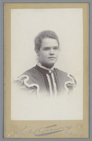 Editor: Here we have "Portret van een onbekende vrouw," or "Portrait of an Unknown Woman," a gelatin silver print, probably from sometime between 1895 and 1904, created at Atelier Studio. It's striking how this image seems to be both a record and an artistic interpretation of its subject. What stands out to you in terms of its visual components? Curator: The immediate observation is the deliberate soft focus characteristic of Pictorialism, eschewing sharp detail for an atmospheric quality. Consider the composition: the central placement of the subject, almost symmetrical, save for a slight turn of the head. This formal structure contributes to the photograph's sense of calm and reserved dignity. Editor: That soft focus almost makes it painterly. What does it communicate about the intent behind the image? Curator: The artist prioritized evoking a mood rather than providing a purely objective likeness. The gradations of tone, from the almost luminous face to the subdued dress, reveal a sensitivity to light and shadow. Notice, too, the subtle ornamentation around the image’s perimeter—an Art Nouveau flourish that serves as a frame within the frame, underscoring the image's constructed nature. How does the use of gelatin silver print as a medium contribute? Editor: It appears to add a vintage aesthetic with the faded look. So, the composition and focus are choices designed to convey feeling through the aesthetic, rather than aiming for crisp, modern detail. Curator: Precisely. We read not merely a likeness, but an intentional articulation of beauty, filtered through a lens of aesthetic values. Editor: I never considered all of those dimensions behind such a simple portrait. I realize now how crucial the deliberate visual elements were to communicating that aesthetic. Curator: Indeed. Every decision regarding composition, focus, and even the choice of printing method contributes to the final reading of the image.
