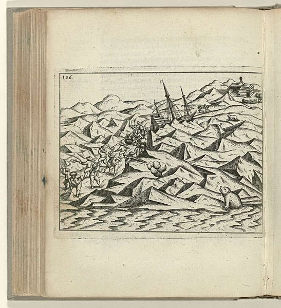 Curator: This engaging piece before us is titled "De sloepen op een brekende ijsplaat, 1597," or "The Sloops on a Breaking Ice Sheet, 1597". Executed with ink on paper around 1598, its authorship is unknown and it currently resides at the Rijksmuseum. Editor: There’s something unsettling about this scene; the cramped, linear strokes make me think of instability, an almost frantic energy. The tonal contrasts certainly emphasize that, no? Curator: Indeed. Let's consider the landscape as a construction. See how the composition relies on a tension between the orderly, almost rhythmic, repetition of the wave-like patterns of ice. That seems to emphasize an uneasy tension to contain the narrative event. Editor: I see what you mean. The repetitive wave patterns feel more like a field of cracked earth, making it look like the land is fighting to survive. And then, we see boats stuck. But I cannot but read this in cultural context: ice carries meanings of both danger and opportunity to those who inhabit that region, an endless struggle. Curator: And if we consider the iconography of boats, they always seem to operate on the edge of somewhere new; they're a symbol of departure, or in some cases perhaps lost hope. The lack of tonal variance across the paper itself flattens out all sense of depth or receding horizon. Editor: Right, it collapses spatial boundaries. Symbolically, this could show our limited grasp of a very complex world. It presents what must be seen as daily strife and hardship, emphasizing, the role and fragility of our relation to our environment, which is something everyone can understand. Curator: What fascinates me is the way in which the formal arrangement mirrors our emotional responses. Editor: True, its crude detail emphasizes its value as a raw cultural document. Curator: It is quite an artifact, giving us the chance to think through an alternative perspective using its visual and contextual symbols. Editor: Exactly, seeing both how it impacts us visually but what its symbolic role reflects on ourselves.