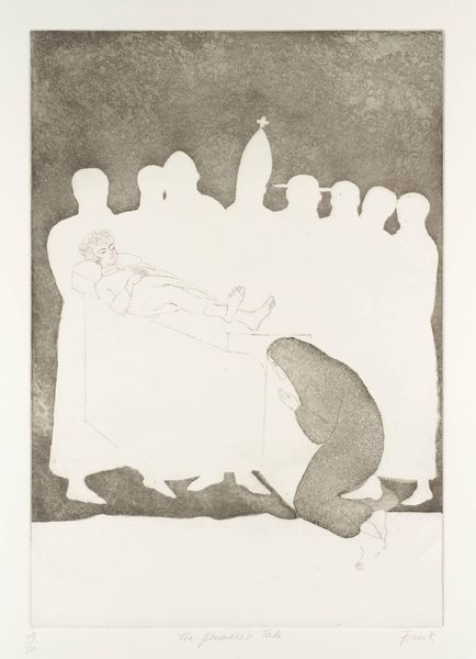 Curator: Dame Elisabeth Frink’s "The Miller’s Tale II" presents a stark and suggestive visual narrative. What strikes you most about its composition? Editor: The starkness is undeniable. The work’s limited tonal range and contrasting forms evoke a dreamlike, almost unsettling atmosphere. Curator: Frink often explored themes of masculinity and power. Considering the figures depicted, how might we interpret this within broader societal structures? Editor: Semiotically, the fragmented body alludes to vulnerability, challenging traditional notions of male strength. The bright orb further complicates this reading, perhaps signifying knowledge or even destruction. Curator: Indeed, Frink’s engagement with Chaucer's themes allows us to investigate the power dynamics embedded within the tale, offering a lens through which we can examine contemporary issues of gender and exploitation. Editor: Frink's formal choices certainly amplify the themes, inviting us to engage critically with its visual language. Curator: Precisely. Frink pushes us to confront uncomfortable truths, both within the narrative and within ourselves.