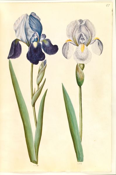 This is Hans Simon Holtzbecker’s rendering of Iris graminea, or grass-leaved iris, made using watercolor and gouache on vellum. The artist's technique, typical of botanical illustration, demanded meticulous attention to detail, capturing the subtle gradations of color and the delicate textures of the iris petals and leaves. Holtzbecker uses thin layers of pigment to achieve transparency, and thicker applications to build up areas of opacity and depth. The process of botanical illustration has a long and rich history, closely tied to scientific inquiry and exploration. These illustrations served as crucial visual records, documenting the diversity of plant life for medicinal, agricultural, and aesthetic purposes. Before photography, the labor-intensive process of botanical illustration was highly valued, requiring both artistic skill and scientific understanding. By elevating these traditional forms of craft, Holtzbecker’s illustration invites us to reconsider conventional hierarchies between art and craft.
