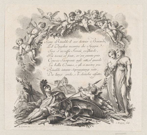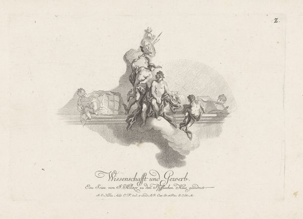 Curator: Here in the Rijksmuseum, we're looking at "Geweld en nijd," or "Violence and Envy," an engraving created by Johann Esaias Nilson around 1765-1770. Editor: It’s chaotic! All those intertwined figures... and the central figure brandishing what looks like a scythe? The composition itself feels violent, reflecting its name I think. Curator: Absolutely. Nilson's baroque style conveys a sense of drama, depicting art personified as a figure suffering. You see violence and envy attacking it, while Time intervenes to rescue it. This fits within a broader understanding of art's role in society and the historical power structures at play. The idea of protecting artistic expression resonates profoundly in our contemporary context, right? Editor: Yes, it makes you wonder about the economics of the artwork at the time. Consider the material process involved—the engraver, the paper, the ink, each playing a crucial role in its dissemination and survival to our present moment. It reflects not only its intrinsic beauty, but the labour, resources, and the societal value ascribed to art. And that, of course, relates directly to contemporary conversations around ownership and access, and whether those considerations even extend to the masses. Curator: I think it raises important questions about who gets to define art and whose voices are valued, that continue to this day. The print is clearly an allegory. I’m seeing some clear intersectional aspects—looking at who has been historically silenced, misrepresented, and actively excluded within these narratives around art and power. The female personification of Art in a patriarchal society, her fragility...It is fascinating when considering the feminist theorists from the past. Editor: Seeing an engraving—so mass-produced relative to a painting, let’s say—suggests art wasn't just for the elite. Its social value lay also in that reproduction and distribution of images. Curator: It certainly adds a layer to our appreciation, considering both the themes portrayed and how accessible art might have been in the 18th century versus how its consumed and regarded now. Thank you. Editor: It certainly underscores how inextricably linked art, labor, and society truly are, and this all extends to its reception across time. Thank you.