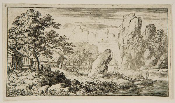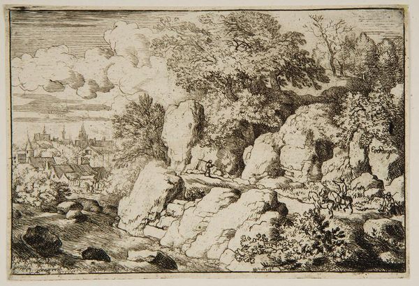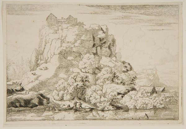 Curator: Allart van Everdingen's "Pines in a Ravine" presents an idealized landscape, a vision of nature imbued with symbolic weight. The trees, rocks, and implied narrative invite us to consider our relationship to the natural world, particularly through a lens of 17th-century Dutch sensibilities. Editor: The stark lines and dense crosshatching give it an almost foreboding feel, doesn't it? I'm drawn to the texture he coaxes from what I assume are basic etching tools. The building perched on top, though, seems disconnected. Curator: In its time, this etching would have been part of a broader discourse about the relationship between humanity and the environment, framed by nascent scientific inquiry and lingering religious beliefs. The castle represents power, both secular and spiritual, dominating nature. Editor: Right, and the process itself is a way of imposing control; the labor needed to create the image, the acid, the mark-making all point to an active modification of materials. Was Everdingen considering the exploitation of natural resources, or celebrating human ingenuity? Curator: Perhaps both. The etching captures the tension between dominion and harmony, a dilemma still relevant today. Editor: Indeed. Looking at it, I'm struck by how this speaks to our ongoing struggle to define ourselves within the ecosystems we inhabit. Curator: It is interesting how this small etching holds so many ideas. Editor: And so much skilled craft.