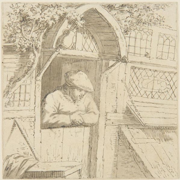 Editor: So, this is "Bonde, der læner sig ud ad en døråbning," or "Peasant Leaning in a Doorway" by Adriaen van Ostade, made in 1672. It's an etching, which gives it a lovely, detailed quality. The mood strikes me as quite melancholic; he looks very pensive. What's your take? Curator: Ostade's genre scenes are indeed fascinating windows into 17th-century Dutch life. But I want to ask, are we sure of that "melancholy"? Because these weren’t just casual snapshots. Prints like these circulated widely. How do you think that distribution influenced how artists like Ostade depicted the working class? Editor: Hmm, so maybe it's not simply capturing reality, but also constructing a particular image for consumption? Is he perhaps catering to a specific audience’s expectations of peasant life? Curator: Precisely. Think about the rise of the Dutch Republic. The middle class gained prominence, wealth increased and thus, we observe that art shifts, right? Genre painting emerged as a powerful and new visual category. Ostade's etching could reflect an idealized or even romanticized view of rural life for an increasingly urban audience. Did these images help solidify certain class distinctions or social hierarchies? Editor: That makes a lot of sense. It adds a whole new layer to it. It’s not just a portrait; it's a carefully constructed image designed to appeal to and perhaps reinforce certain beliefs among its viewers. I didn't realize genre paintings could have such complex societal implications. Curator: And how does the medium – etching, a reproducible art form – reinforce this effect on society, what kind of role does it perform in the play of representation? Editor: Well, prints were affordable. Therefore, accessible to the middle class who purchased the image; a middle class in need of these representations. Thanks! It really changed my perception of this piece!