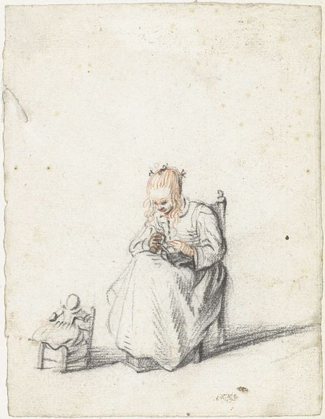 Curator: This drawing, believed to be from 1652, is titled "Young Woman Making Lace in Profile" and is by Harmen ter Borch. It's currently held in the Rijksmuseum. The medium is ink on paper, which gives it a delicate, almost ephemeral quality. Editor: There’s a certain quiet intimacy about it, isn’t there? The pen strokes are so spare, but they capture the stillness of the moment so beautifully. The lone slipper by her foot suggests domesticity, private life. Curator: Precisely. Lace-making at the time wasn't just a craft; it was an economic engine, especially for women. Ter Borch has depicted the rise of genre painting and focused on the beauty of the everyday. Editor: And there's such careful attention to her costume, even in this sketch. The folds of her dress, the intricate cap – they speak volumes about her social standing and perhaps the values placed on domestic skills at the time. It shows us the social expectation put on women to become lace makers during this era. Curator: Costume is indeed key to understanding the image, since it symbolizes much of the history of that moment. The woman is anonymous, in a sense, but the details give us insight to how the 17th-century Dutch middle class lived. But Ter Borch made sure she was not anonymous: he wrote her name in the corner of the sketch. Editor: Yes! Also, I noticed she has the lace pillow on her lap. This image captures a cultural snapshot, not just a woman at work, but also an industry and a set of gendered expectations bound together by material objects like that pillow and her delicate equipment. The symbolism of production seems right here. Curator: I agree. There is this lovely duality present. On the one hand, there is a sense of the sitter's humility while showing her in this simple garb with a singular focus, creating for economic value. On the other hand, a humble interior scene represents a major force of the Netherlands and women as being economic engines of labor and skill in their everyday lives. Editor: It’s a powerful reminder that what seems ordinary now held its own significance back then. Seeing the symbols helps us remember the lives and expectations women of the time experienced and faced. Curator: I hadn't considered it from such an individual view! It's been a rich experience. Editor: Definitely. The way we bring those past connections to present issues, especially on a deeply human level, I see those ripple effects more clearly now.