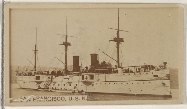 Editor: This is "Miantonomoh, U.S.N.", a trading card from 1895 by Allen & Ginter, a company known for cigarettes. It combines drawing, printmaking and photography in one collectible image. I’m struck by how it feels so ordinary, yet also presents this immense symbol of military power. What's your take? Curator: This card encapsulates a shift in how we perceive value and production. Forget "high art" – this is about mass consumption, material processes. The paper itself, the ink, the printing techniques... these were becoming increasingly standardized and accessible, influencing the dissemination of images and ideas. How does the ship, a potent symbol of industrial and military might, become just another element in this matrix of capitalist production? Editor: So, the value isn't in some inherent artistic quality but in its place within a commercial system? Curator: Exactly! Consider the labor involved. Who were the designers, the printers, the workers in the tobacco factory? How were they compensated? The card isn’t just an image of a ship, it’s a trace of a complex network of labor and resource extraction, bundled together to sell cigarettes. Notice, too, the very disposability implied – this wasn't meant to last forever. Editor: That makes me think about our current obsession with collectibles, how even ephemeral objects become fetishized commodities. Curator: Precisely! These seemingly insignificant cards tell us volumes about the social and economic currents of the time and about the industrial process by which popular values and desires get their tangible forms. It is not a neutral carrier of an image; it is an element in a process. Editor: That’s a really different way to look at art, or rather, "art." Thanks for expanding my perspective! Curator: My pleasure. Hopefully, we can start asking the critical questions that unravel how artworks and commodities mediate reality.