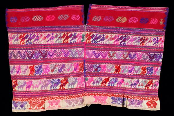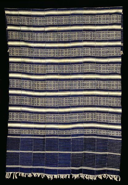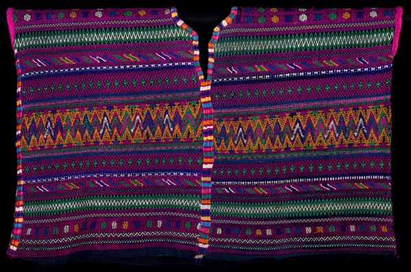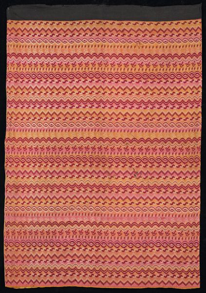 Curator: Here we have a Luntaya-style skirt, dating from the mid-20th century, held within the Minneapolis Institute of Art. The skirt seems to be crafted from both silk and cotton, offering a rich tactile experience. What's your initial response to this piece? Editor: My first impression is that it's playful and visually loud. The undulating horizontal patterns immediately capture your eye with the layered effect and the pink, red, and purple hues. It’s unapologetically vibrant, even joyous. Curator: Indeed. These colours and repetitive patterns speak to the deep-seated human desire for visual order and pleasure. Historically, in many cultures, including within Southeast Asia where these skirts are often created, the weaving of textiles carried profound symbolic weight. Think of the symbolic meanings encoded within these patterns; these skirts were rarely just adornment. Editor: Precisely. Thinking about adornment and its cultural performance, who would have worn this? These textiles become charged when considering gender roles and socio-economic status of its wearer, and their ability to challenge norms. That complex history deserves attention. Curator: Certainly. The weaver's own life, imbued in each thread and colour choice, whispers of her social context. The skill involved in creating such even, regular patterns surely also had some social importance, setting its wearer apart through artistic expression. Each visual element possibly worked as visual cues, culturally recognized by many. Editor: Definitely. It also feels radical. While the technique might look ‘traditional’ on the surface, clothing –especially women’s clothing – has always been about pushing back, finding freedom in cultural confines. Curator: Looking closely at those zigzagging lines, one cannot help but think how, from prehistory to modernity, these represent, in one culture or another, everything from water and fertility to boundaries and the cycle of life. Editor: Absolutely, those layered meanings become critical in thinking through fashion design as both cultural artefact and deeply personal experience. Curator: What do you take away from this today? Editor: Today it encourages me to reconsider textiles not as static objects but dynamic interfaces between identity, culture, and artistic agency. It’s not just something pretty; it’s powerful.
