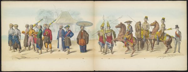 Curator: Johan Hendrik Hoffmeister created this watercolor illustration in 1857, titled "Maskerade van de Delftse studenten, 1857 (plaat 7)". Editor: Okay, my first impression is a stage play feeling to this piece – figures parading across what could be a minimalist stage. There's a whimsical quality, like costumed performers frozen mid-act. Curator: Precisely! And the artwork is not as simple as it appears. Although it depicts students, we must situate it within the broader context of Orientalism. This means considering how it reflects, and perhaps perpetuates, colonial perspectives on non-Western cultures and how that reflects power dynamics of the time. Editor: Ah, it has got that "storybook-vision" effect, so flattened, neat, a row of human pawns, I almost didn’t spot it as the representation of subjugation. What about the individuals? Curator: The portrayal of each figure merits attention. Note the students' attire, presumably intended to evoke an "Eastern" aesthetic through a Western lens, the illustration also employs various symbols and postures influenced by genre-painting that tell a specific, narrative. What can we glean from these constructed representations? Editor: Hmmm. So it is trying to convince us it is real through genre’s “snapshot” quality? There is definitely that static "tableau" vibe here. Look at the repetitive nature, so neatly and almost cruelly displayed, without motion. It's strange! The palette has something very charming about it but does it distract from the real context? Curator: I’m glad you picked up on that element. We might consider if its aesthetics distract from or rather amplify certain social themes that could be at play within the context. It is vital we scrutinize these representations for potential implications regarding identity and race and remember who is seeing and who is seen. Editor: True! Because if this illustration normalizes a view, and someone profits off that… then what feels charming to me might carry harmful history! Wow! Thanks for guiding my reflection! Curator: And thank you for making that observation. By acknowledging that an illustration as this carries those layers, we move towards more enlightened and conscious ways of relating with historical representations.