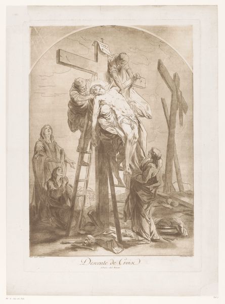 Editor: So here we have "Kruisafname: tweede plaat" or "Descent from the Cross: second plate", an etching and engraving by Rembrandt van Rijn, dating probably from 1633. It’s overwhelmingly…dark. Claustrophobic even. What do you see when you look at this work? Curator: Dark indeed. But also powerfully lit, wouldn't you agree? Think of light not just as illumination, but as emotional revelation. See how the figures lowering Christ from the cross are bathed in it? They’re active, alive, wrestling with a terrible task. Yet at the base, others huddle in shadow, consumed by grief, lost in their private hell. Editor: Yes, that contrast is striking. The light feels almost…theatrical. Was Rembrandt consciously staging this? Curator: Staging... now that’s an interesting way to look at it! Remember, Rembrandt was a master storyteller. He uses light and shadow—chiaroscuro—to focus our attention. And not just on the *what*, but on the *how*…how does faith look in the face of immense sorrow? It’s not a clean, easy answer. Editor: I suppose I had imagined it to be…grander? It feels so intimate, like a secret glimpse into suffering. Curator: Exactly! Etching allows for that intimacy. Unlike grand historical paintings, prints were for smaller, private devotion. Rembrandt offers not a glorious spectacle but a human tragedy, made all the more visceral by the darkness pressing in. Almost feels as though he is dragging the viewers right in with the mourners below... wouldn't you say? Editor: I think you are right! Seeing the raw emotion captured like that is amazing, particularly the grieving faces in shadow - much to mull over. Curator: Well, it certainly gives new weight to the concept of 'divine darkness,' doesn't it?
