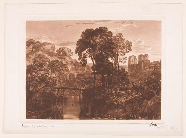 Curator: Ah, this is Joseph Mallord William Turner's "Raglan Castle," housed here at the Harvard Art Museums. Editor: The sepia tones immediately evoke a sense of nostalgia, a romantic ruin softened by time and nature. The layering of the etching is simply gorgeous. Curator: Notice how Turner uses the aquatint process to create tonal variations and atmospheric perspective, pushing and pulling our eye through the landscape. The castle, though prominent, becomes almost secondary to the enveloping natural elements. Editor: I'm drawn to that contrast. The labor, the quarrying, the sheer physicality of building a castle like Raglan—all that effort ultimately succumbing to the patient, relentless encroachment of foliage and water. Curator: I see it more as a harmonious balance. The structural strength of the castle, the organic forms of the trees, both unified by the artistic vision. Turner orchestrates a dialogue between the man-made and the natural. Editor: Perhaps. It's a potent reminder of the ephemerality of human endeavors. Thank you for sharing the detail of its construction; it really emphasizes its temporality.