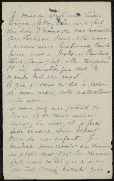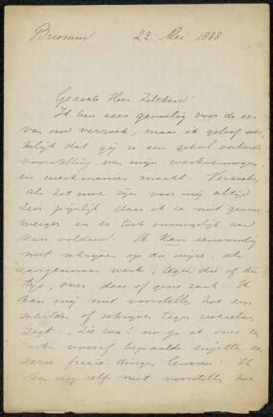 Editor: We are looking at "Brief aan Jan Veth," or "Letter to Jan Veth," potentially created between 1905 and 1929 by Jacob Pieter Moltzer. It’s an ink drawing on paper. The density of the lettering, its texture, and even the visual weight of the ink—it’s quite striking. What strikes you when you look at this piece? Curator: From a formalist point of view, the drawing presents a compelling interplay of positive and negative space. Note how the uniform application of ink and the repetitive nature of cursive lines generate a strong texture, transforming the paper surface into a nuanced field. The orientation further accentuates a hierarchy, doesn’t it? Editor: A hierarchy? In what way? Curator: Notice how Moltzer has situated the writing from the top-left to the bottom-left, seemingly grounding it to the page. The top right, left blank, functions as a stark visual pause, amplifying the density of the written content. And if you isolate each letterform, you might discover its intrinsic shape and proportion, each carefully constructed to form legible words, then unified through that rhythm across the picture plane. Editor: I see what you mean. Focusing on the pure shapes and their arrangements allows us to appreciate the careful balance Moltzer has struck here. I initially viewed this as merely a historical document, but by concentrating on the artistic choices—the spatial composition, the balance, and sheer texture of the writing— it transforms into something visually compelling. Curator: Precisely! It’s a piece where the act of writing becomes, in itself, a kind of drawing.