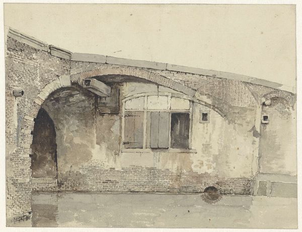Curator: We're looking at "Wachttoren met aangrenzende gebouwen" or "Watchtower with Adjacent Buildings," a drawing done in ink, watercolor and pencil by Jan Asselijn, sometime between 1626 and 1677. It currently resides at the Rijksmuseum. Editor: It has such a melancholy feel. The sepia tones, the crumbling facade of the tower, even the solitary figure in the window, it all speaks of time and its erosive power. Curator: Asselijn was working in a period where the representation of ruins and the past became intertwined with ideas of national identity. There's a romanticisation, but also a quiet acknowledgement of the transient nature of power. What do you make of that lone figure you pointed out? Editor: They’re almost an afterthought, barely sketched in, yet their presence changes the whole narrative. They become the inheritor, the keeper of memory in this decaying structure. Note the creepers; their growth hints at both nature reclaiming the architecture and an image of resilience, new life among decay. Curator: Exactly, it suggests an ongoing cycle. The watchtower, despite its crumbling state, maintains a certain level of functionality; consider it an imperfect but ever-present part of civic duty. It’s a visual statement on governance. The adjacent buildings hint at a wider social infrastructure connected to the tower. It represents the interlinking of the individual with the state. Editor: And the archway. Subliminally, its shadow recalls similar, more triumphal, arches from the height of the Roman Empire, whose collapse it now silently echoes, in sepia. Even now, the shadow recalls the arch's origin as both entrance and border. Curator: Yes, absolutely! And in that sense, Asselijn encourages a deep reading. It is very astute of him to link governance of both places using this subtle arch detail. He really seems to bring forth a discussion about time itself. Editor: Absolutely. "Watchtower with Adjacent Buildings" is a silent but evocative reflection on power, time, and the enduring human spirit.