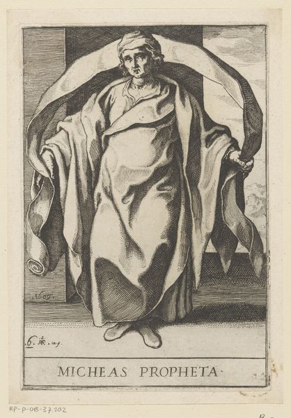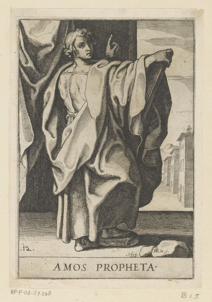 Curator: This engraving, "Profeet Ezechiel," created sometime between 1606 and 1609, comes to us from the hand of Raffaello Schiaminossi. It resides here at the Rijksmuseum. What's your immediate read of it? Editor: It strikes me as somber, but also quite commanding. The sharp lines give a wonderful weight to Ezekiel's robes and beard, don't they? It is a full figured stance. The details create a real sense of gravitas and purpose, a formidable pronouncement of ancient wisdom. Curator: The technique of line engraving certainly amplifies that solemnity. It's fascinating how Schiaminossi uses solely line to create such depth and shadow. Prints like this circulated widely, weren't intended for grand spaces but for individual study, reflecting a democratizing influence in Baroque imagery. Editor: Democratizing… Perhaps. I imagine wealthy patrons acquiring the originals of drawings while this would trickle down. But there is such skill here! What about those tiny details, like the mountain range visible through the window. It gives a vastness to Ezekiel's purpose. He's set against this backdrop of natural law, if that makes sense? Curator: That does make sense! The mountainous background offers more than just perspective; it visually connects him to a landscape that mirrors the monumental quality of his pronouncements. In that light we can read it as almost hyper-realistic. Prints and engravings during this time served purposes, so one would want a clear, concise image with allegorical implications. Editor: Still, there’s a sort of… humility, I see in it. The prophet standing not on some marble plinth, but seemingly on just a few rough stone bricks with bits chipped off no less, in front of us in very low cut toga sandals showing off his very mortal toes! What’s that about? Curator: The bricks do humanize him. Though rendered with incredible skill, it also hints to a figure not entirely removed from the quotidian reality of the everyday. This way it emphasizes a shared humanity, in the context of religious leadership and Baroque sensibilities, quite radical actually. Editor: You are right about that detail and humanity it is imbued with. A fresh look and outlook from past artists to modern interpretations that are reinterpreted over the generations! A small piece to have such weight in thought! Curator: Precisely! And through his rendering and attention to historical details of that specific era, an opening is brought forth to an engaging experience.