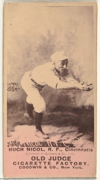 Editor: This is a baseball card, from the "Old Judge" series, made in 1887. It's a photographic print featuring Walter Henry Porter, a pitcher for the Kansas City Cowboys, and it’s actually a photomontage. I'm struck by how staged it looks compared to modern sports photography. What's your take on it? Curator: It's interesting you point that out. Think about the cultural context. Photography was still relatively new, not easily accessible, and certainly not capable of capturing action shots like we have today. This card, part of a larger series included in cigarette packs, functioned less as pure documentation and more as promotional material, helping to popularize both baseball and the “Old Judge” brand. How do you think that influenced its creation and reception? Editor: So, it wasn’t necessarily about capturing the true grit of the game? More about creating a desirable image linked to leisure and consumption? Curator: Precisely! This card represents a very specific intersection of sport, commerce, and technological advancement. Baseball was rapidly becoming a national pastime, and businesses were eager to capitalize on its popularity. The aesthetic conventions of portraiture were also still dominant, informing the stiff pose. It's also fascinating that the card presents this idealized figure. Do you think that contributes to a larger social narrative of athleticism, particularly given the timeframe? Editor: Definitely, it suggests a celebration of athletic prowess, associating it with qualities like respectability and even health, despite being linked to cigarettes. So, in a way, these cards helped to build a cultural myth around baseball heroes? Curator: Exactly! The staged nature, the idealized pose, even the inclusion of the brand name, all contribute to a narrative carefully crafted to resonate with a growing audience. Editor: That's fascinating; I'd initially overlooked the deeper cultural forces at play in what seems like a simple baseball card. Now I see the image in a whole new light. Curator: I think we both do! Analyzing such imagery reveals complex interplay of sports, culture, and commerce during this formative period in American history.