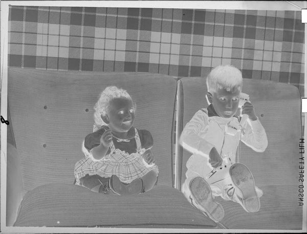 Editor: Here we see a silver gelatin print, Untitled (children outside with puppet and dog), by Lucian and Mary Brown. It’s a small, intimate scene. What strikes me is the contrast between the sharp detail of the children and the soft, almost dreamlike quality of the dog. What do you see in the interplay of light and form? Curator: The formal arrangement, particularly the stark juxtaposition of textures, commands attention. The print’s tonal range, from deep blacks to near-white highlights, creates a dynamic visual rhythm. Notice how the children's figures, rendered with precise clarity, sharply contrast against the diffused form of the dog. Editor: I see. So, the photographers are using the contrast to draw our eye to certain details? Curator: Precisely. The composition seems carefully constructed to emphasize this binary, inviting us to consider the relationship between clarity and ambiguity within the frame. This evokes not merely a scene but rather, a meditation on perception itself. Editor: That's a fascinating way to look at it. I never would have considered the composition in such a theoretical way. Curator: It’s through this close examination of form that the essence of the work is unveiled.